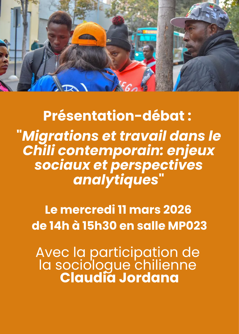 Salle MP023Présentation-débat : "Migrations et travail dans le Chili contemporain : enjeux sociaux et perspectives analytiques" en présence de Claudia Jordana